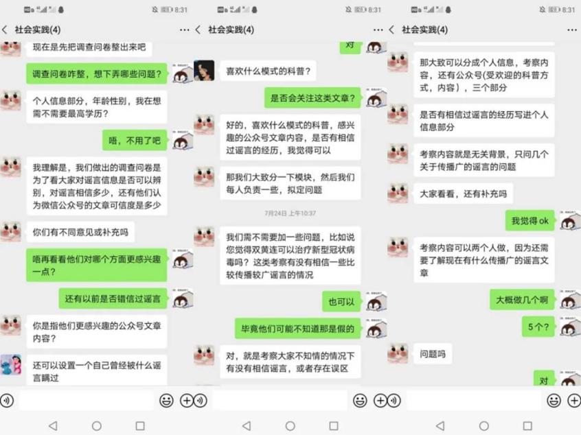2020年7月6日,社会实践做爱自拍 -微信公众号+“谣言体”中医药科普模式的探索和实践服务团队正式开始暑期线上社会实践的讨论。通过微信语音通话,小组负责人与成员沟通交流后,决定使用微信公众号推送文章的方式来进行中医药知识的辟谣和科普。接着,组员们在线进行了前期调查问卷的任务分工。成员分为三组,一组负责问卷中个人信息填写部分;’一组通过查阅文献资料、咨询老师等途径,编写问卷中关于中医药谣言的部分;最后一组则编写关于公众号文章科普的形式、内容等相关调查问题。