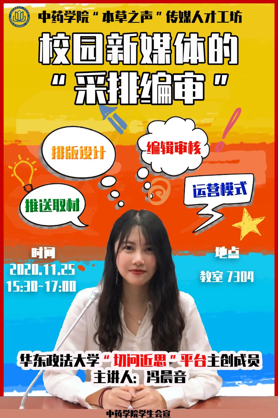 本期“本草之声”传媒人才工坊将由冯晨音小姐姐向大家讲授校园新媒体的运营模式,以及推送取材、排版设计、编辑审核几个方面的注意事项。想要在新媒体宣传有所提升的你,千万别错过哦!