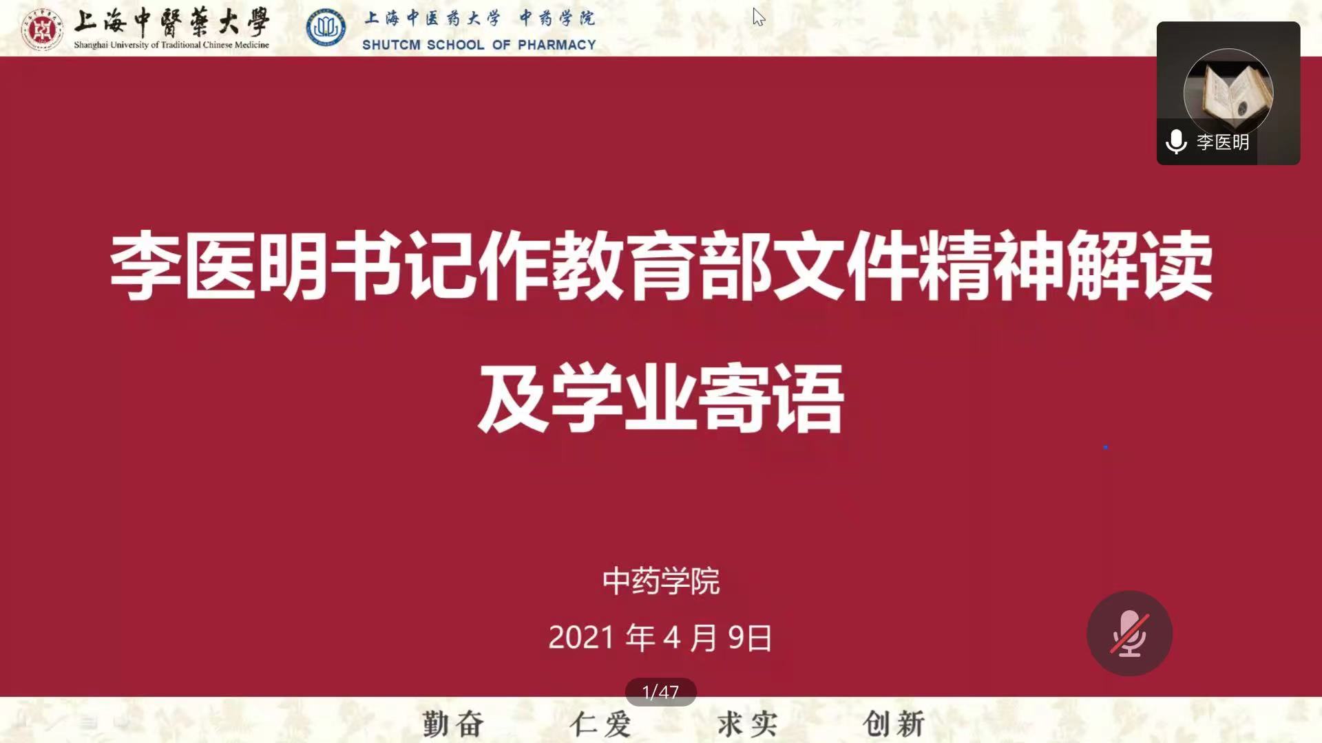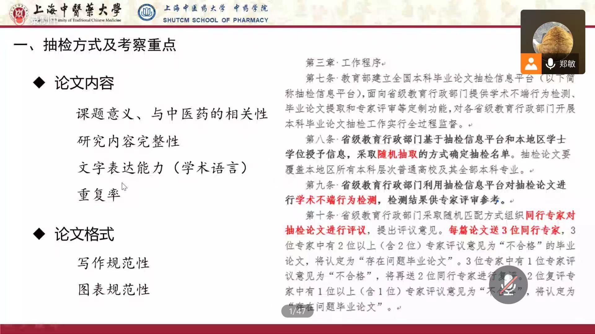 为贯彻落实教育部关于《本科毕业论文(设计)抽检办法》的精神,保证本科人才培养质量,严把出口关,做爱自拍 于2021年4月9日晚上通过腾讯会议在线上召开了2021届中药学专业本科生学术规范宣讲会。