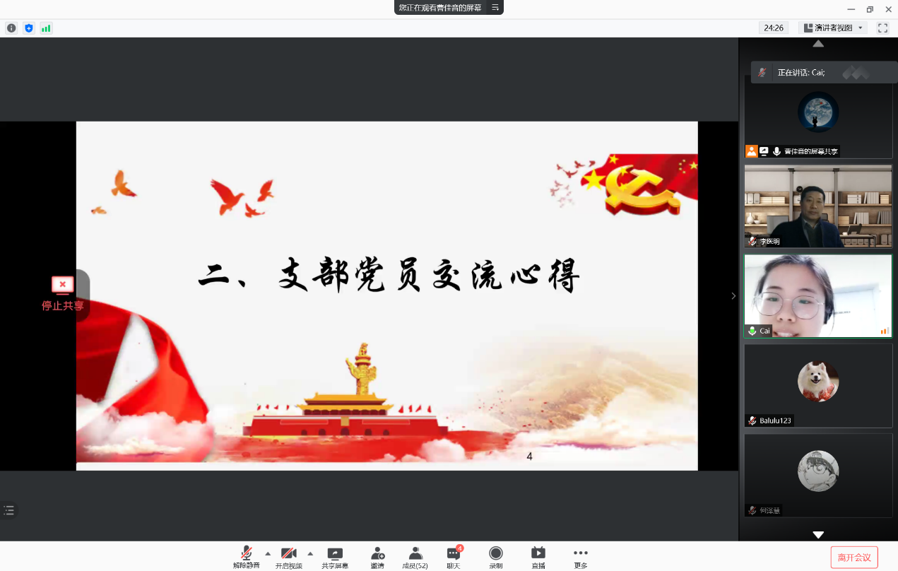 扬斗志激发党员延续精神血脉。在一百年的非凡奋斗历程中,一代又一代的中国共产党人顽强拼搏、不懈奋斗,构筑起了中国共产党人的精神谱系。传承红色基因,赓续共产党人的精神血脉、始终保持革命者大无畏的奋斗精神,是每一个共产党人神圣的使命与责任。党史学习教育动员是一次固本培元、精神滋养的学习动员会,支部党员心中深有感触,纷纷表达内心感悟与所得,支部内与支部间进行心得交流。阮航同志认为,作为学生党员,我们更应该学习党史,铭记历史,以先辈们的优良品德与高尚情操不断鞭策自身。何泽慧同志真发言,作为百强样板党支部的一员感到无比光荣,因此更要主动学习党史,不断提升学习能力,增强自身使命感,为党支部发展添砖加瓦。来自江西兴国的何远志同志更是谈到了家乡革命老区的英雄先辈们的可歌可泣的事迹,并以此为激励,更加努力学习,用所学专业知识报效国家。