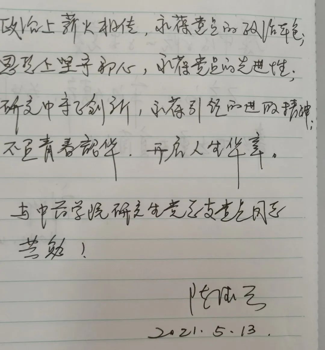 对于年轻一代的党员同志,陈老师也给予了期望与鼓励:政治上薪火相传,永葆党员的政治本色;思想上坚守初心,永葆党员的先进性;研究中守正创新,永葆引领的进取精神;不负青春韶华,开启人生华章!
