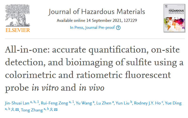 近日,我校张彤教授团队在中药二氧化硫残留快速检测方法研究中取得进展。该研究成果All-in-one: accurate quantification, on-site detection, and bioimaging of sulfite using a colorimetric and ratiometric fluorescent probe in vitro and in vivo于近日发表于Journal of Hazardous Materials(DOI: //doi.org/10.1016/j.jhazmat.2021.127229)。