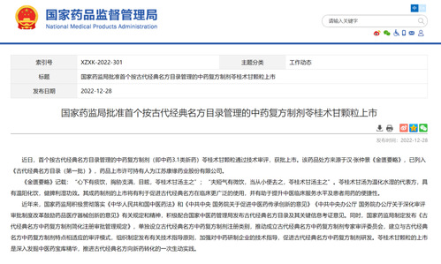 2月28日,我校季光团队和张彤团队与江苏康缘药业股份有限公司合作研发的苓桂术甘颗粒获批上市,这是国内首个按古代经典名方目录管理的中药复方制剂(中药3.1类新药),为经典名方新药注册探索了新路径。
