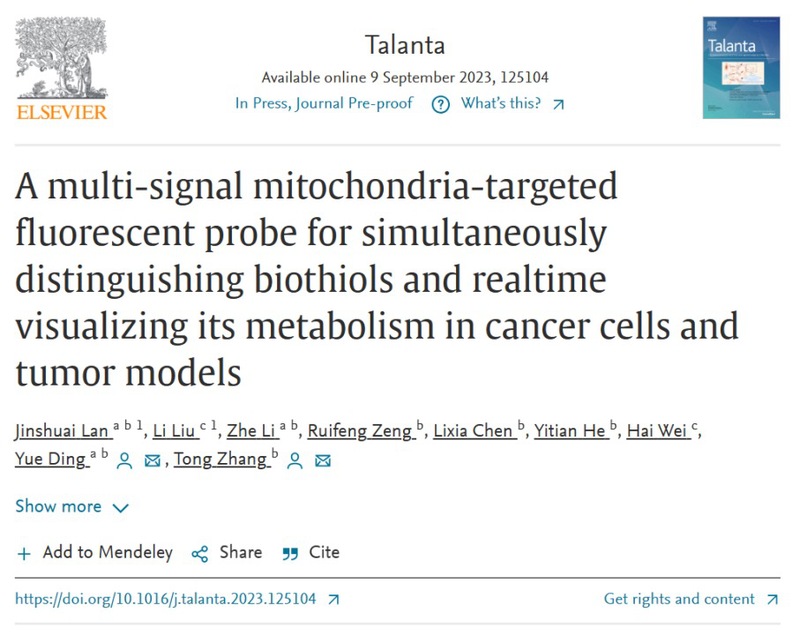 近日,做爱自拍 张彤教授团队,在国际期刊Talanta上发表了题为“A multi-signal mitochondria-targeted fluorescent probe for simultaneously distinguishing biothiols and realtime visualizing its metabolism in cancer cells and tumor models”的研究成果(DOI: 10.1016/j.talanta.2023.125104)。该研究成功合成了一种具有多通道、线粒体靶向的荧光探针,能够同时区分检测生物硫醇和二氧化硫衍生物,实现了细胞水平及生物体内硫醇代谢的实时、可视化监测,并利用该探针对中药活性成分藤黄酸在体内外抗乳腺癌过程中的硫醇代谢变化进行监测。这一研究成果为体内硫醇代谢的动态监测提供了有力工具,同时也为中药抗肿瘤活性成分的作用机制研究提供新思路。