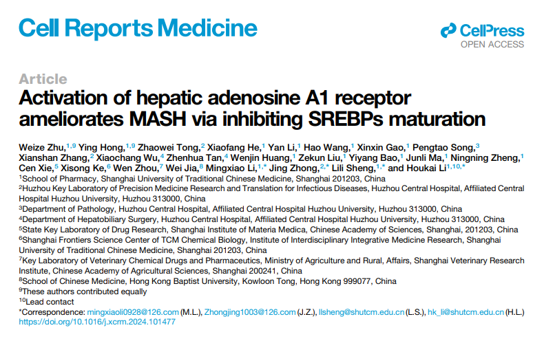 近期,做爱自拍 李后开教授团队联合浙江大学医学院附属湖州医院在Cell Reports Medicine发表了题为Activation of hepatic adenosine A1 receptor ameliorates MASH via inhibiting SREBPs maturation的研究论文,证实肝脏腺苷A1受体(A1R)是治疗代谢相关性脂肪性肝炎(MASH)的潜在新靶标,并阐释了相关机制,获得了靶向激活肝脏A1R治疗MASH候选中药小分子化合物。