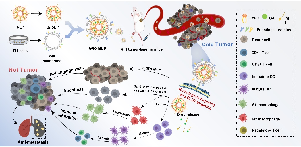 在本研究中,为提高Rg3GA协同抗三阴性乳腺癌作用,利用“药辅合一”的中药制剂策略和仿生技术,通过肿瘤细胞膜修饰以及人参皂苷Rg3替代胆固醇,开发了一种多功能仿生脂质体包载藤黄酸GAG/R-MLP),旨在通过同源靶向和葡萄糖转运蛋白靶向将药物特异性递送至肿瘤部位和转移病灶。准确到达并渗透到肿瘤病灶后,G/R-MLP中的Rg3GA组合通过杀死肿瘤细胞、抑制肿瘤细胞迁移和侵袭,显著抑制肿瘤生长和肺转移。此外,G/R-MLP通过抑制血管生成和提高抗肿瘤免疫力,有效重塑肿瘤微环境。G/R-MLP总体通过协同化疗、抗血管生成和免疫疗法有效治疗三阴性乳腺癌。本研究将中医药理论与现代仿生纳米递药系统相结合,为GA的临床转化应用提供参考,也为三阴性乳腺癌治疗提供策略。