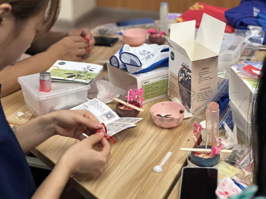 在实践团队成员的带领下,同学们很快开始了茶花香薰烛的制作。首先,使用酒精湿巾对所有需要用到的容器进行了消毒,并将大豆蜡与精油混合,盖好瓶盖,放入自热盒中,加入冷水。在等待过程中,同学们对于蜡烛烛底进行图案的DIY创作,将烛芯竖直立于底部。此时,将已经完全融化为液体的大豆蜡进行调色,并将蜡液倒入小碗中,最后在顶部加入干花进行装饰,等待完全凝固后,一个个精致的茶花香薰烛浮现眼前。