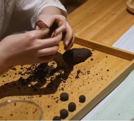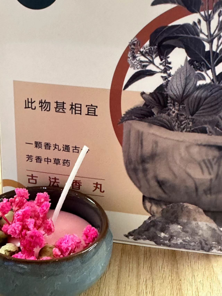 香丸源于中医的蜜丸,是在中医熏蒸疗法的理论基础上延伸出来的中医治疗方法的生活化体现。“香”是纯阳之性,特别是香药调和成的香丸,因没有烟火的燥热,其补足正气、祛除邪气、防病养生的效果最佳。本次制作的香丸中,主要包含了陈皮、紫苏、檀香以及艾草。陈皮药性温和,不仅能理气健脾、燥湿化痰,还能调中、止痛,其香味浓郁持久。紫苏是解表散寒、行气和胃的良药,具有抑菌、解热、抗炎和抗氧的药理作用。檀香具有行气止痛、散寒调中的功效,此外,还具有一定的抗菌和镇静安神的功能。艾草香味浓烈,全草可以入药,端午素来有挂艾草的寓意,用于驱虫杀菌,祛邪避害,祈福纳吉。