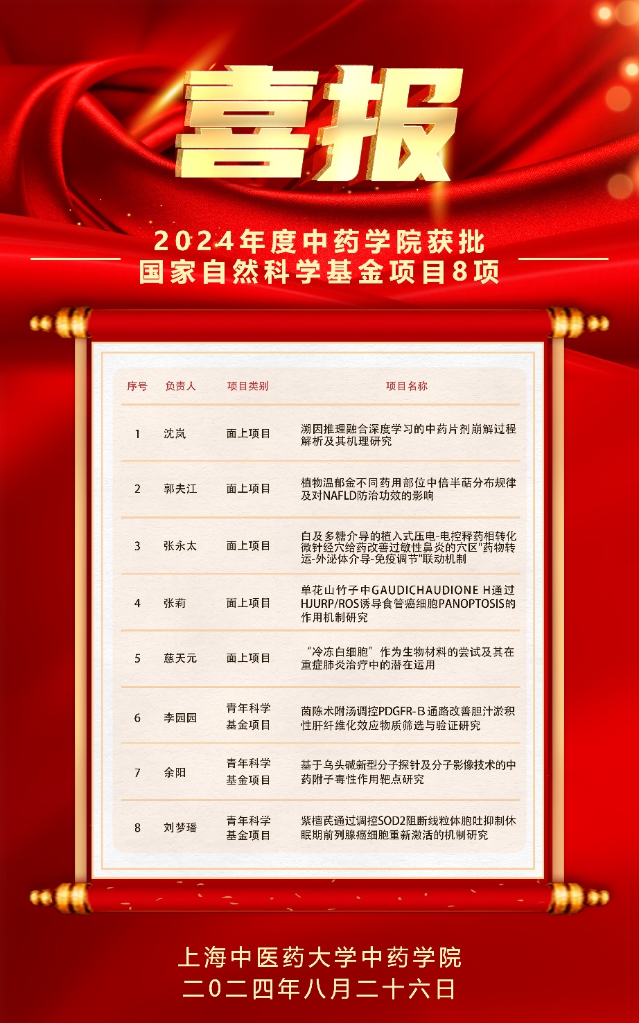 近日,国家自然科学基金委公布了2024年国家自然科学基金集中申报项目评审结果,做爱自拍 获批8项,其中面上项目5项、青年项目3项,总资助金额336万元,创历史新高。