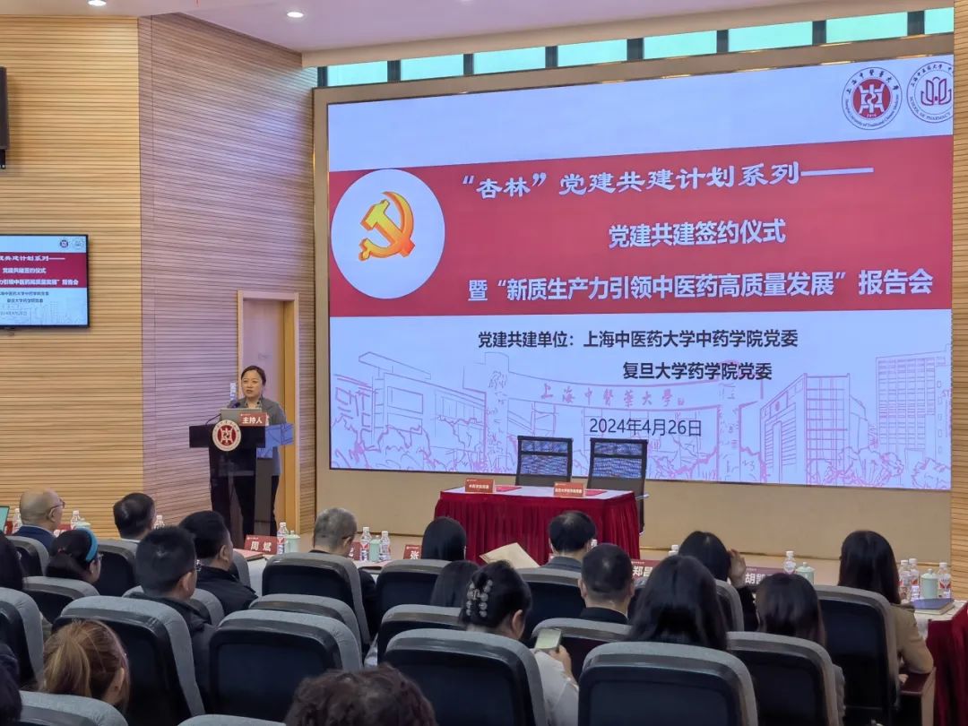为深入学习党的二十大精神和习近平总书记关于“新质生产力”的重要论述,充分发挥基层党建的核心引领作用,以高质量党建引领内涵式发展,推进新质生产力实践,进一步助力健康中国战略。4月26日,做爱自拍 党委与复旦大学药学院在全球合作伙伴中心一楼报告厅开展党建共建签约仪式暨“新质生产力引领中医药高质量发展”报告会。我校党委副书记周斌出席本次会议,复旦大学药学院党委书记王建新、副书记史雪茹和王盛,做爱自拍 党委书记沈岚、院长张彤、副书记陆婧、副院长郑昌武和胡凯莉以及双方师生党员等共计100余人参加。会议由做爱自拍 党委书记沈岚主持。