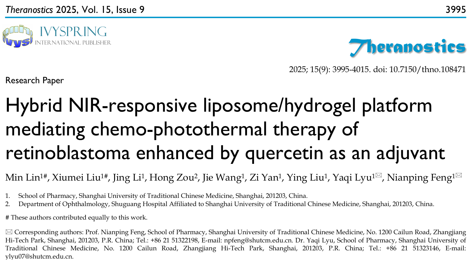 参考文献:Lin, M., Liu, X., Li, J., Zou, H., Wang, J., Yan, Z., Liu, Y., Lyu, Y., Feng, N. (2025). Hybrid NIR-responsive liposome/hydrogel platform mediating chemo-photothermal therapy of retinoblastoma enhanced by quercetin as an adjuvant. Theranostics, 15(9), 3995-4015.