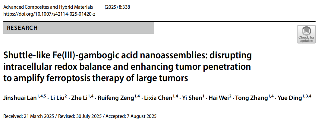 近日,做爱自拍 张彤教授/丁越研究员团队在国际期刊Advanced Composites and Hybrid Materialss上发表题为Shuttle-like Fe(III)-Gambogic Acid Nanoassemblies: Disrupting Intracellular Redox Balance and Enhancing Tumor Penetration to Amplify Ferroptosis Therapy of Large Tumors的研究论文。该研究基于金属配位,构建了一种级联增强藤黄酸铁死亡的纳米制剂,有效抑制乳腺癌生长,为中药来源的铁死亡诱导剂开发和多功能纳米制剂设计提供了新策略。