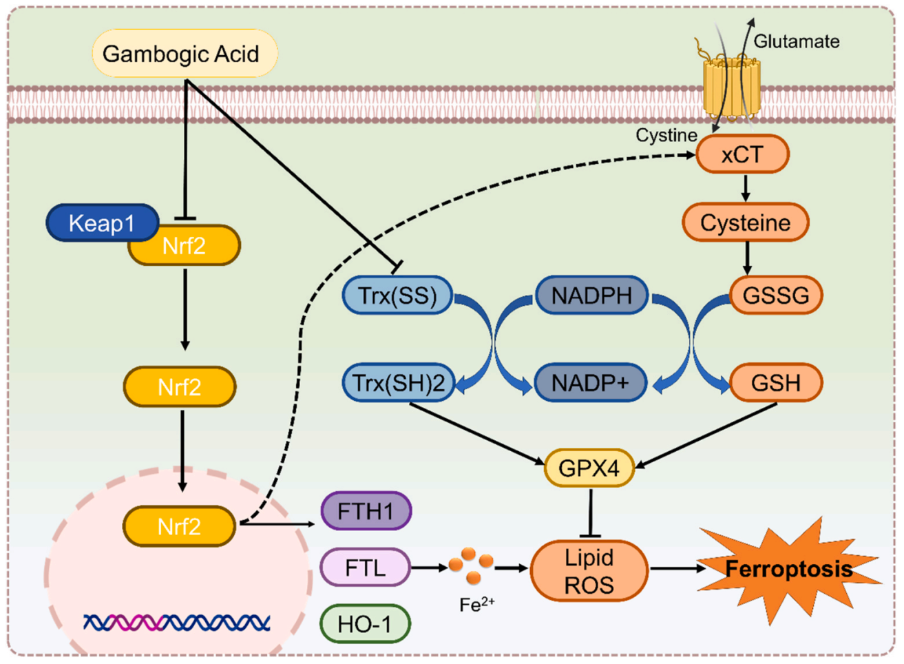 近年来,铁死亡在肿瘤治疗领域展现出巨大潜力,其通过脂质过氧化积累高效杀伤肿瘤细胞的作用备受关注。然而,现有铁死亡诱导剂存在靶向性差、细胞内抗氧化系统补偿以及肿瘤微环境抗性等局限,导致治疗效果不佳。针对这一难题,团队首次发现并证明藤黄酸是一种铁死亡诱导剂,并证明了基于Kelch样ECH关联蛋白1—核因子E2相关因子2(Keap1-Nrf2)介导的谷胱甘肽(GSH)以及硫氧还蛋白(Trx)双抗氧化通路是藤黄酸诱导细胞铁死亡的作用机制(Free Radical Biology and Medicine., 2024, 218: 26-40)。基于藤黄酸在诱导铁死亡抗肿瘤的作用优势,进一步成功构建了梭形纳米递药系统GFGH NPs,显著提升了肿瘤深层穿透能力,增强脂质过氧化物蓄积实现了多途径级联增强铁死亡,有效抑制乳腺癌生长(Advanced Composites and Hybrid Materials., 2025, 8:338)。