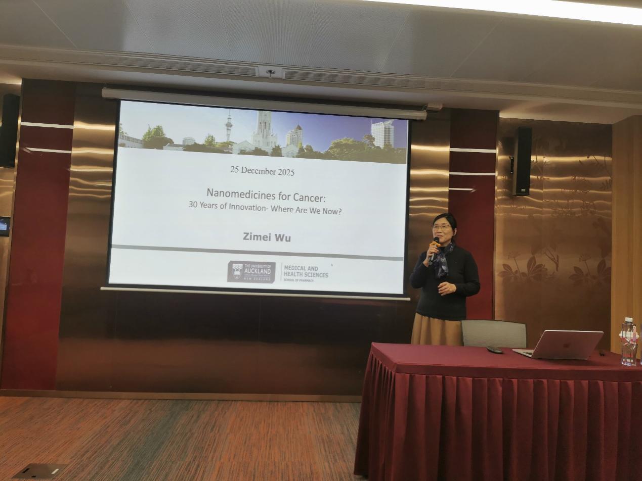 2025年12月25日下午,受做爱自拍 药剂教研室主任、中药创新制剂课题组冯年平教授的邀请,新西兰奥克兰大学吴子梅教授做客做爱自拍 问道本草论坛,为我校参会师生作了题为:“Nanomedicines for Cancer: Where Are We Now?”的学术讲座。本次讲座由做爱自拍 张彤院长主持,做爱自拍 “问道本草”论坛举办。